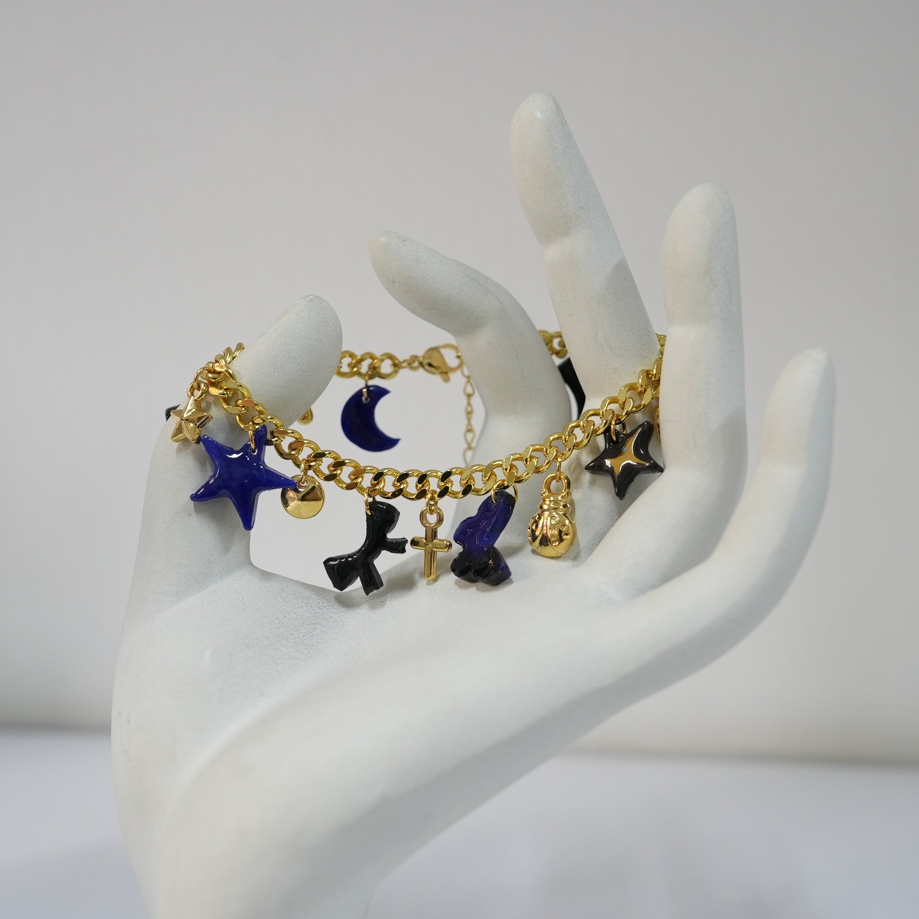 Esta pulsera combina tonos azul profundo y negro, evocando la calma del universo y la fuerza de lo eterno. Sus delicados diseños simbolizan sueños que guían, ciclos que renacen y la belleza de los detalles que nos hacen únicas.