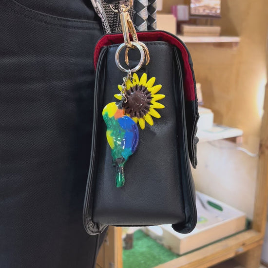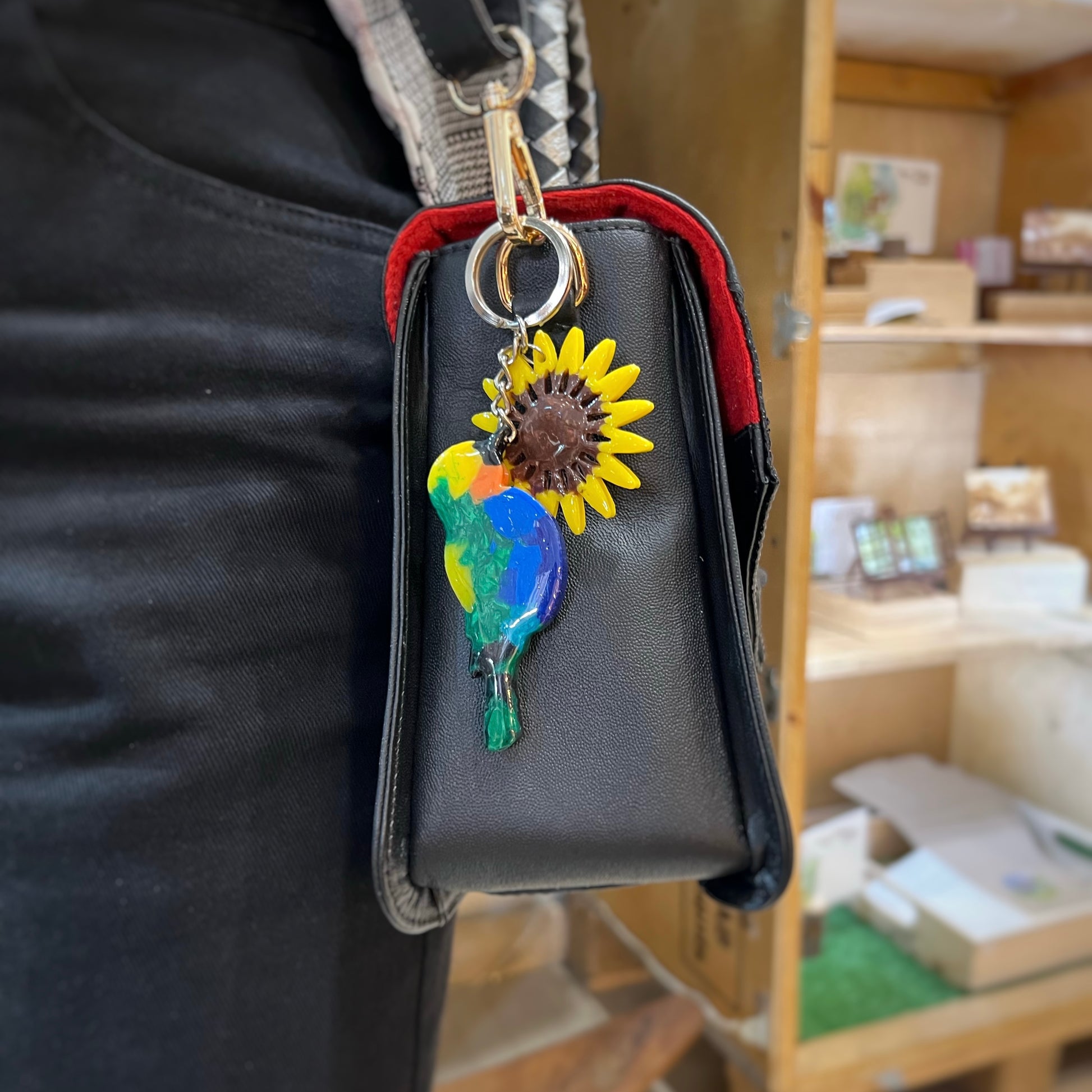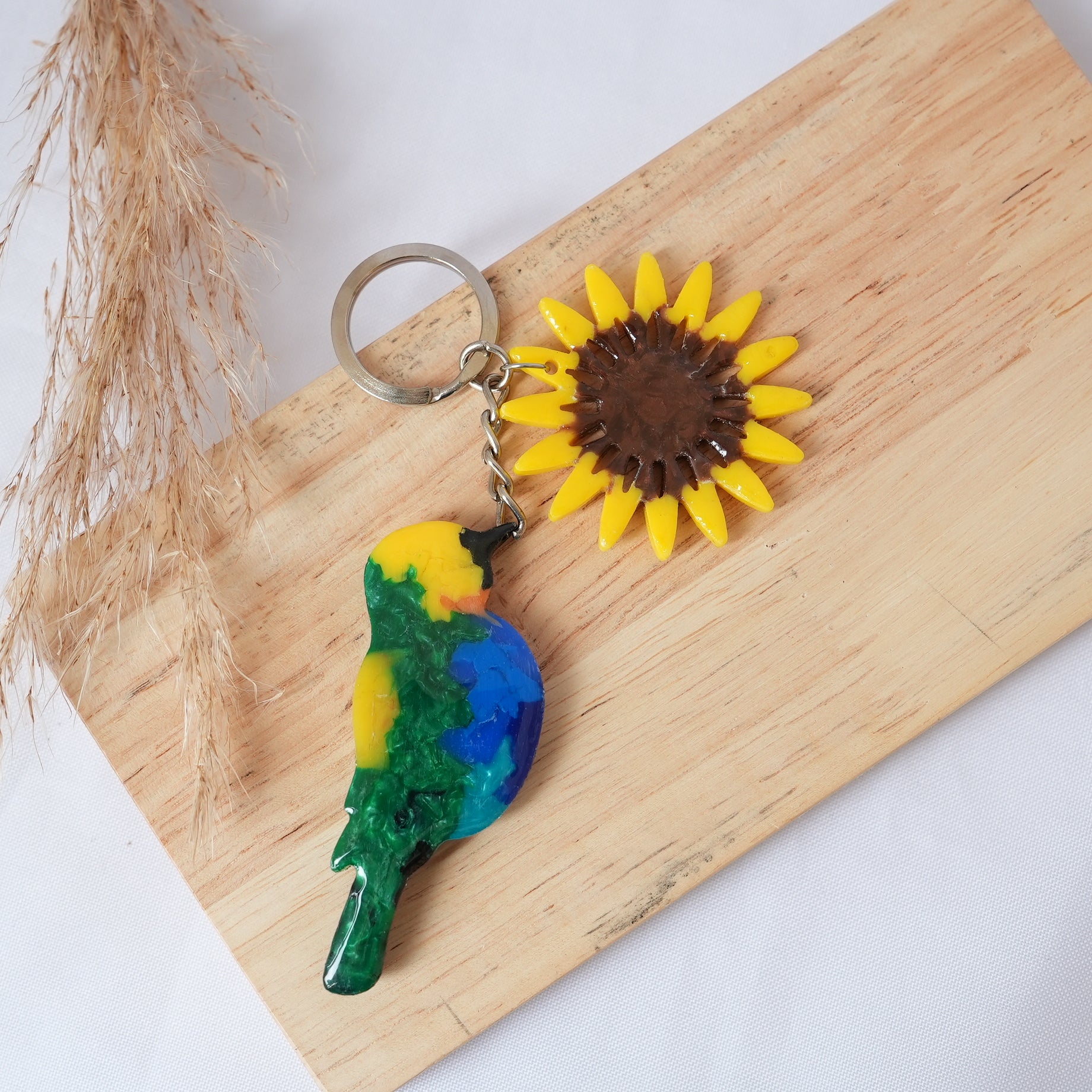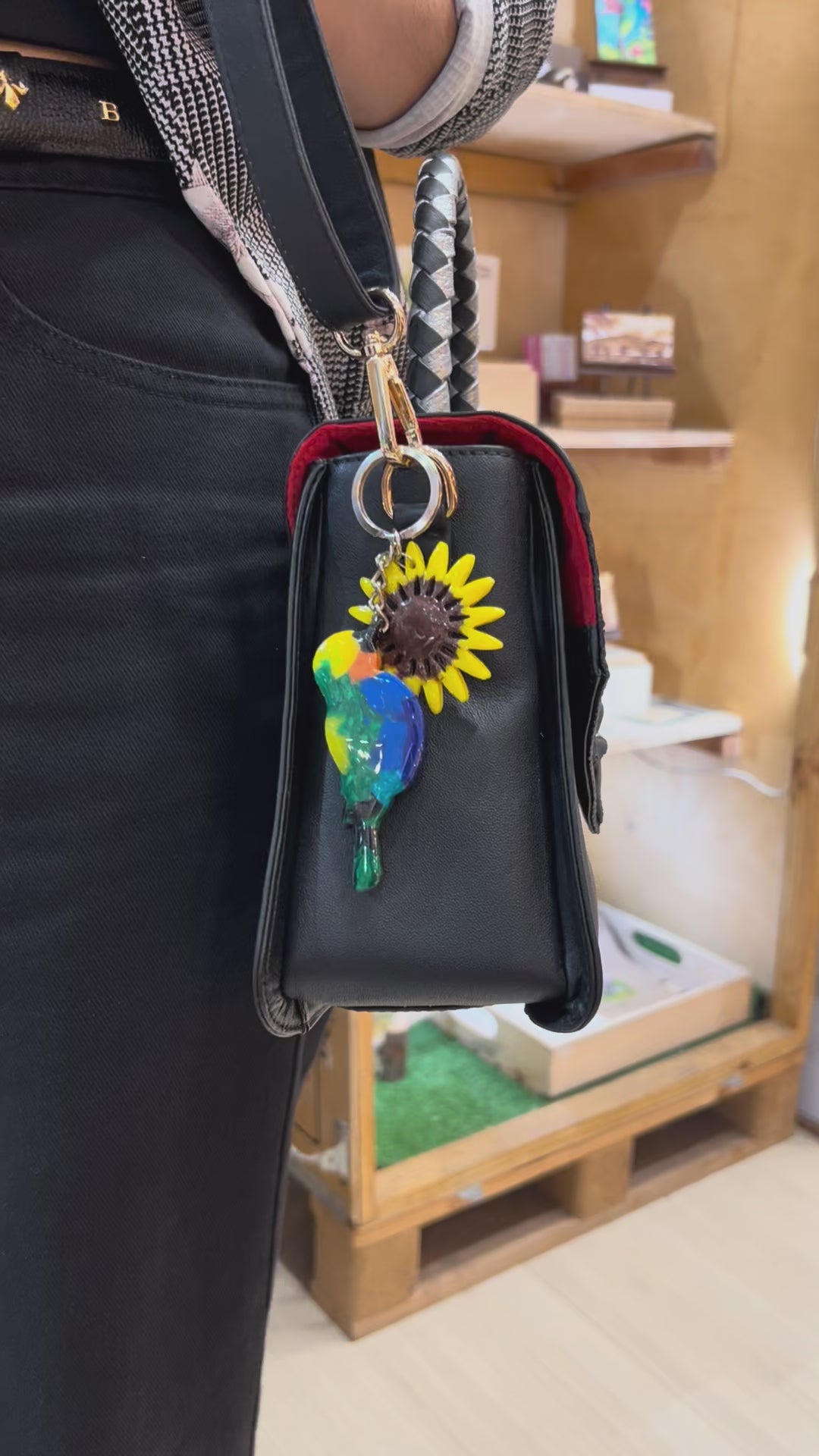 El poder del lenguaje y la naturaleza como origen. La silueta de la Tángara, ave vibrante y libre; se encuentra con el girasol, símbolo de luz y orientación, en una composición que transmite optimismo y movimiento. Elaborado a partir de tapas plásticas transformadas en un llavero/colgante sutil de estilo consciente, identidad y conexión con lo esencial.